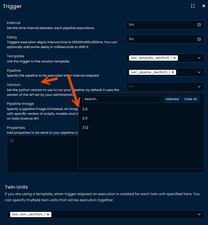 Once you tested your pipeline, you can now change the trigger (using API) or via the UI and set the desire python version the same.