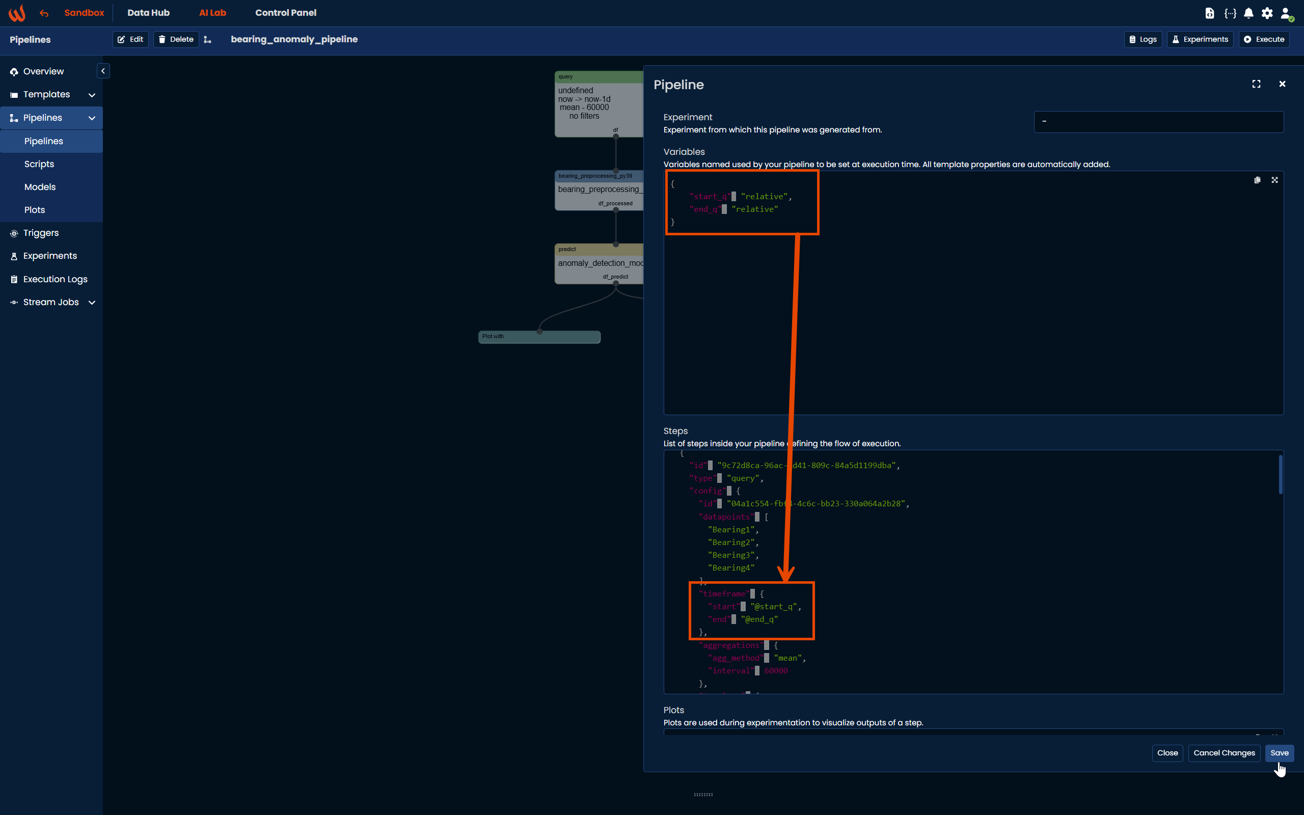 )Ideally, link your pipeline to an experiment to track result of its execution in the experimenting screen. You can create/update one with the following logic: