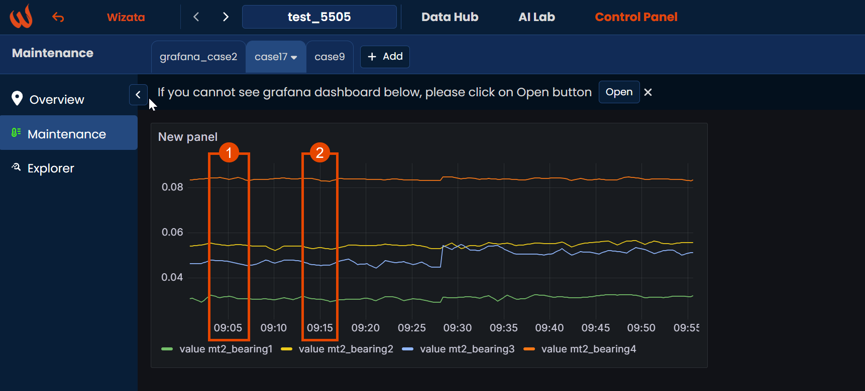 To illustrate this behavior, refer to the image below: If you hold the left mouse button from point 1 and drag it to point 2, Grafana will zoom into that specific area. The Time Selector will then automatically switch to an absolute time range, reflecting the time interval of the selected window (in this example, from 09:05 to 09:15).
