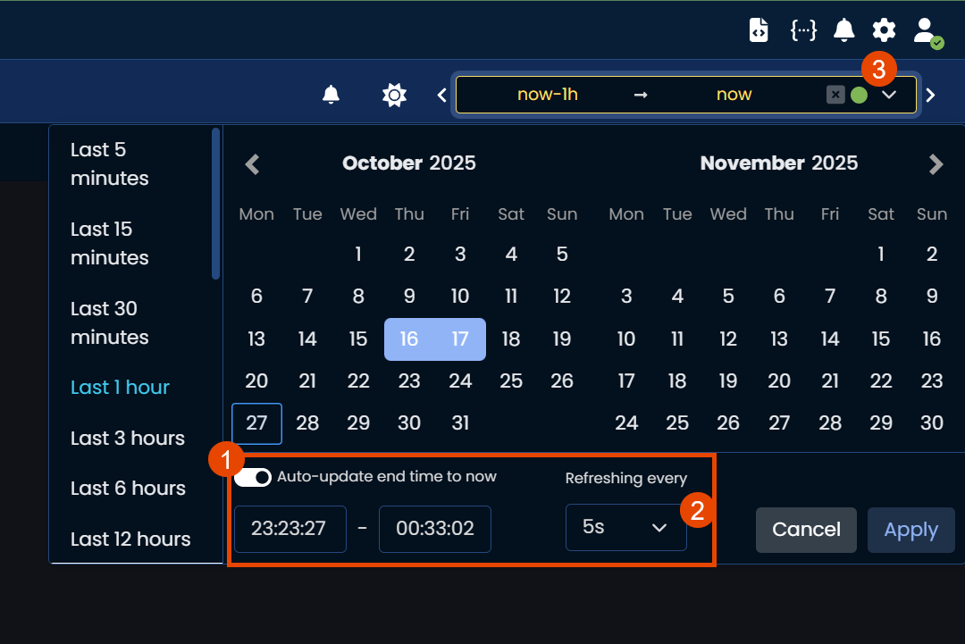 When the Auto-update end time to now option is enabled, the time range dynamically refreshes to keep the end parameter aligned with the current time. The refresh interval can be configured from 5 seconds up to 1 day.