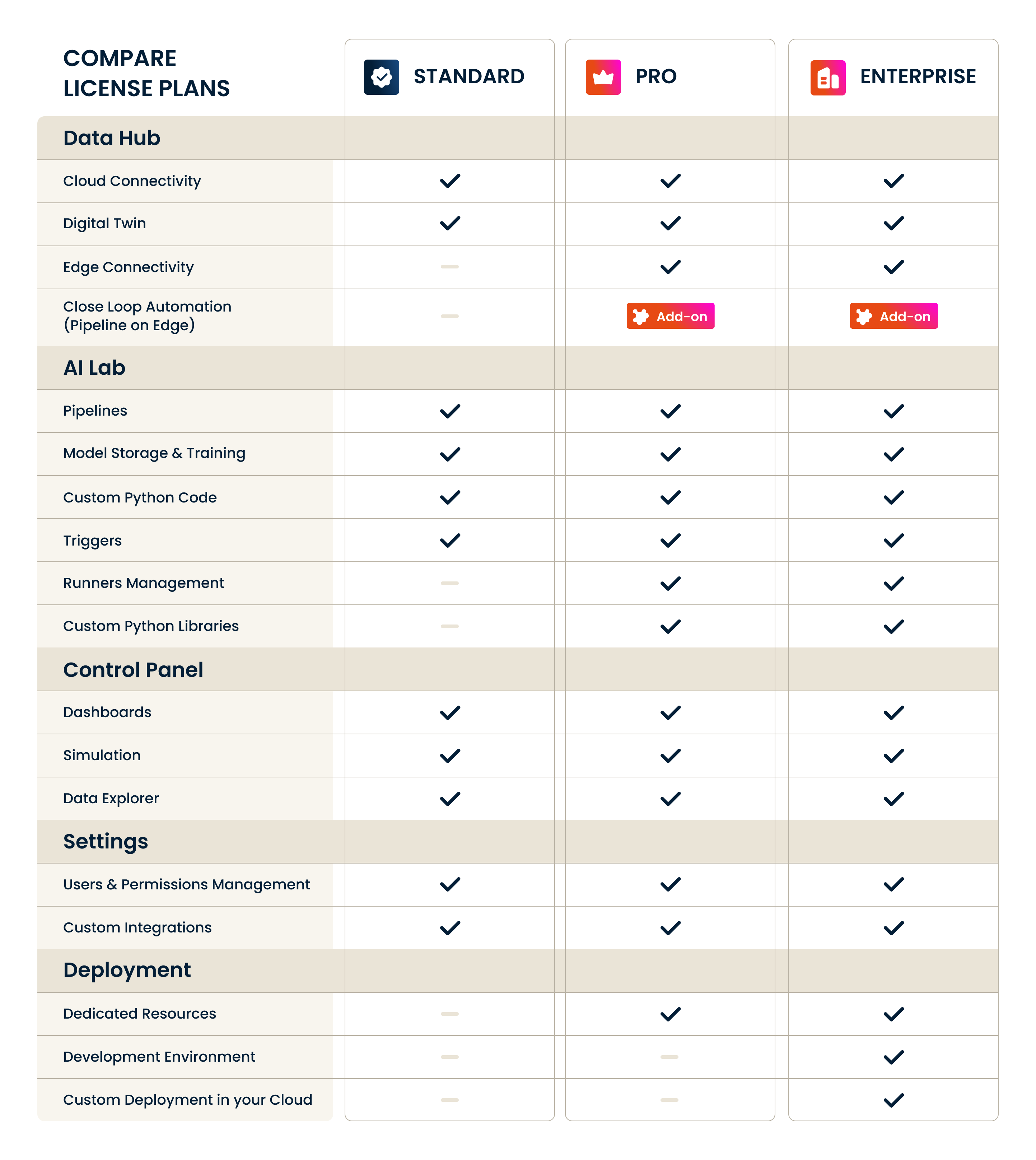 There are three license plans ; Standard, Professional and Enterprise. Please find here the list of included features and potential add-ons by license plan: