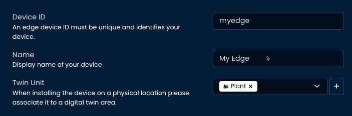 The edge device id must contains only alphanumerical and '_' characters. It must be unique across your app. The twin unit linked to your edge should represent the physical location used as the scope of the edge (e.g. a plant, a production line, ...).
