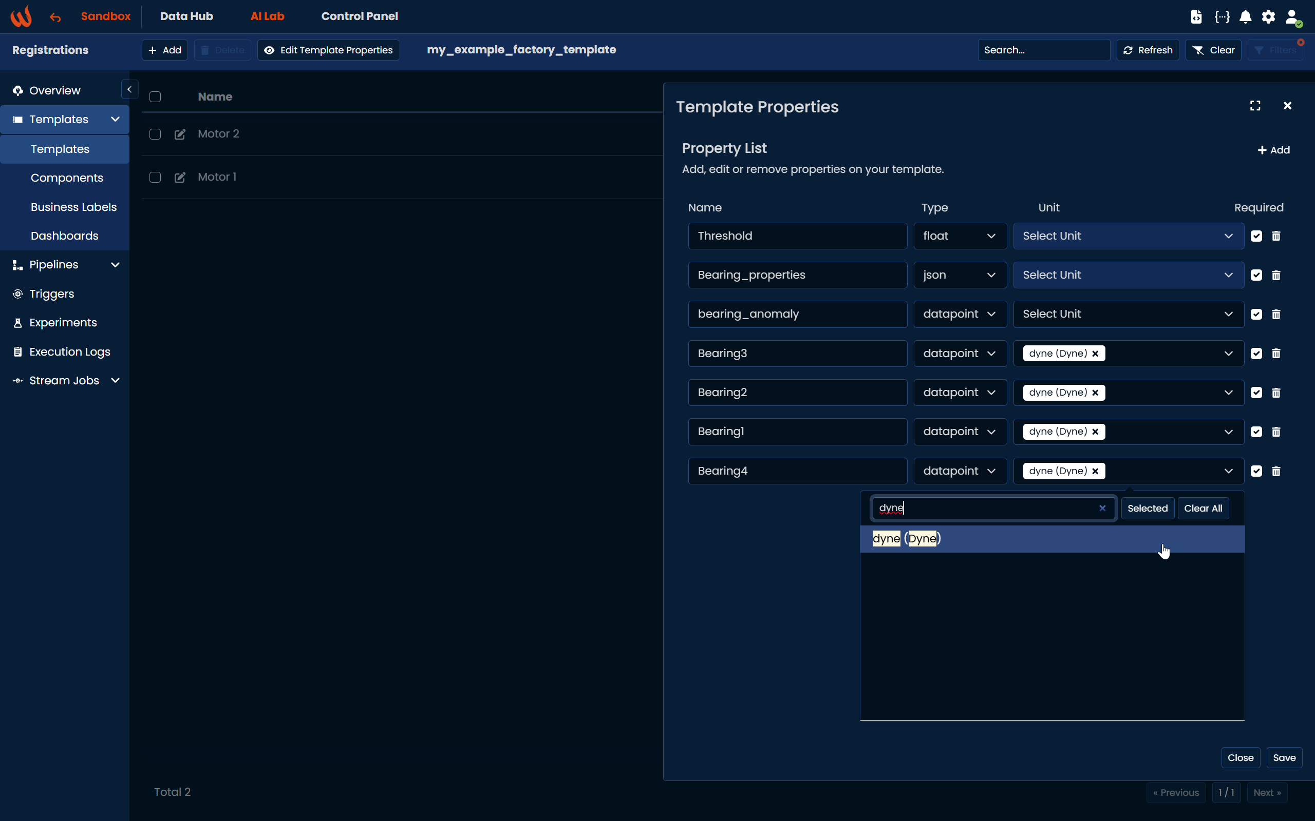 For example: A “my_example_factory_template” might have as datapoint, Bearing1, Bearing2 and Bearing_anomaly and as variable threshold and as JSON Bearing_properties
